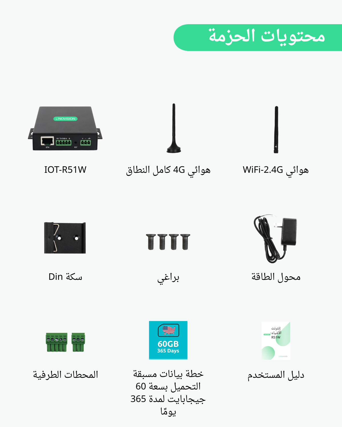 • باقة بيانات مسبقة التحميل بسعة 60 جيجابايت لمدة 365 يومًا. يتم التفعيل تلقائيًا فور تشغيل الجهاز، صالحة لمدة 365 يومًا بإجمالي استخدام بيانات 60 جيجابايت. مناسبة لاتصال أجهزة استشعار IoT.
