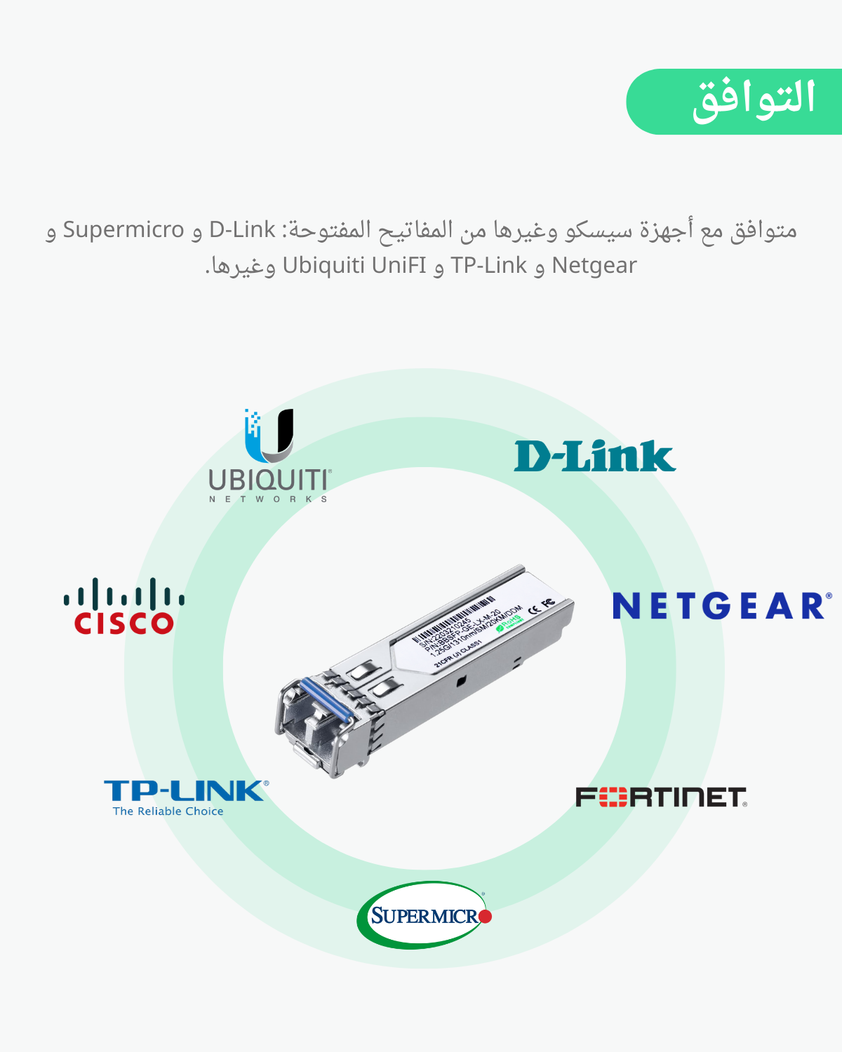 • التوافق: متوافق مع سيسكو ومفاتيح مفتوحة أخرى: D-Link، Supermicro، Netgear، Fortinet، TP-Link، ومفاتيح Ubiquiti UNIFI.