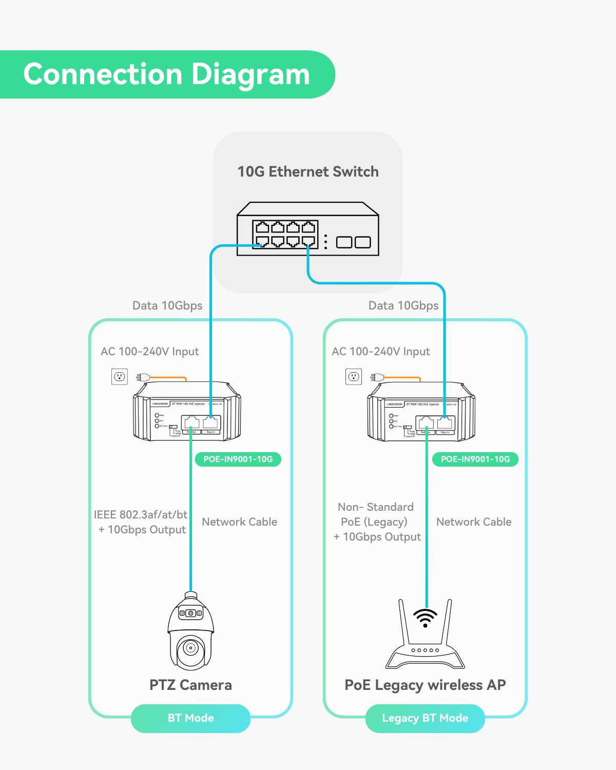 - سرعة عالية كاملة 10G -مدخل إيثرنت بسرعة 10Gbps ومخرج PoE بسرعة 10Gbps عبر كابلات Cat6a أو أعلى. مثالي لأنظمة الأتمتة الصناعية، مراقبة الفيديو، وشبكات الشركات. يدعم التفاوض التلقائي للسرعات 10Gbps / 5Gbps / 2.5Gbps / 1Gbps / 100Mbps / 10Mbps.