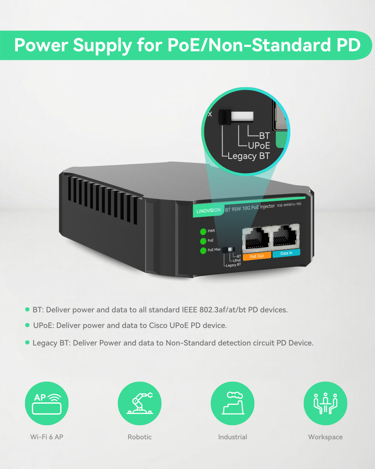 - توافق عالي - متوافق مع معايير IEEE 802.3af/at/bt PoE. سهل التبديل بين الأوضاع باستخدام مفتاح DIP ليتوافق مع أجهزة PoE ++/ PoE+ / PoE / الأجهزة غير الداعمة لـ PoE (Legacy) / UPoE. يدعم أجهزة متعددة مثل كاميرات PTZ، كاميرات IP، هواتف VoIP PoE، نقاط وصول لاسلكية PoE، أجهزة Cisco UPoE، مكبرات صوت IP وغيرها.