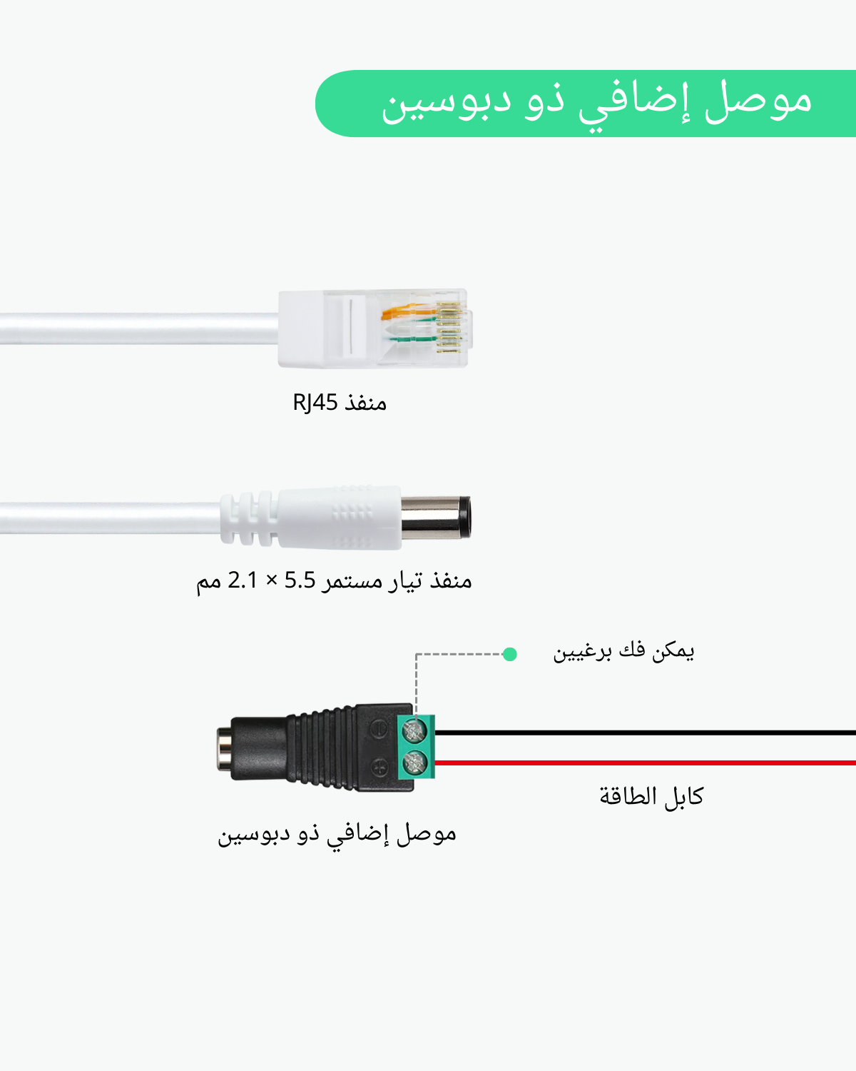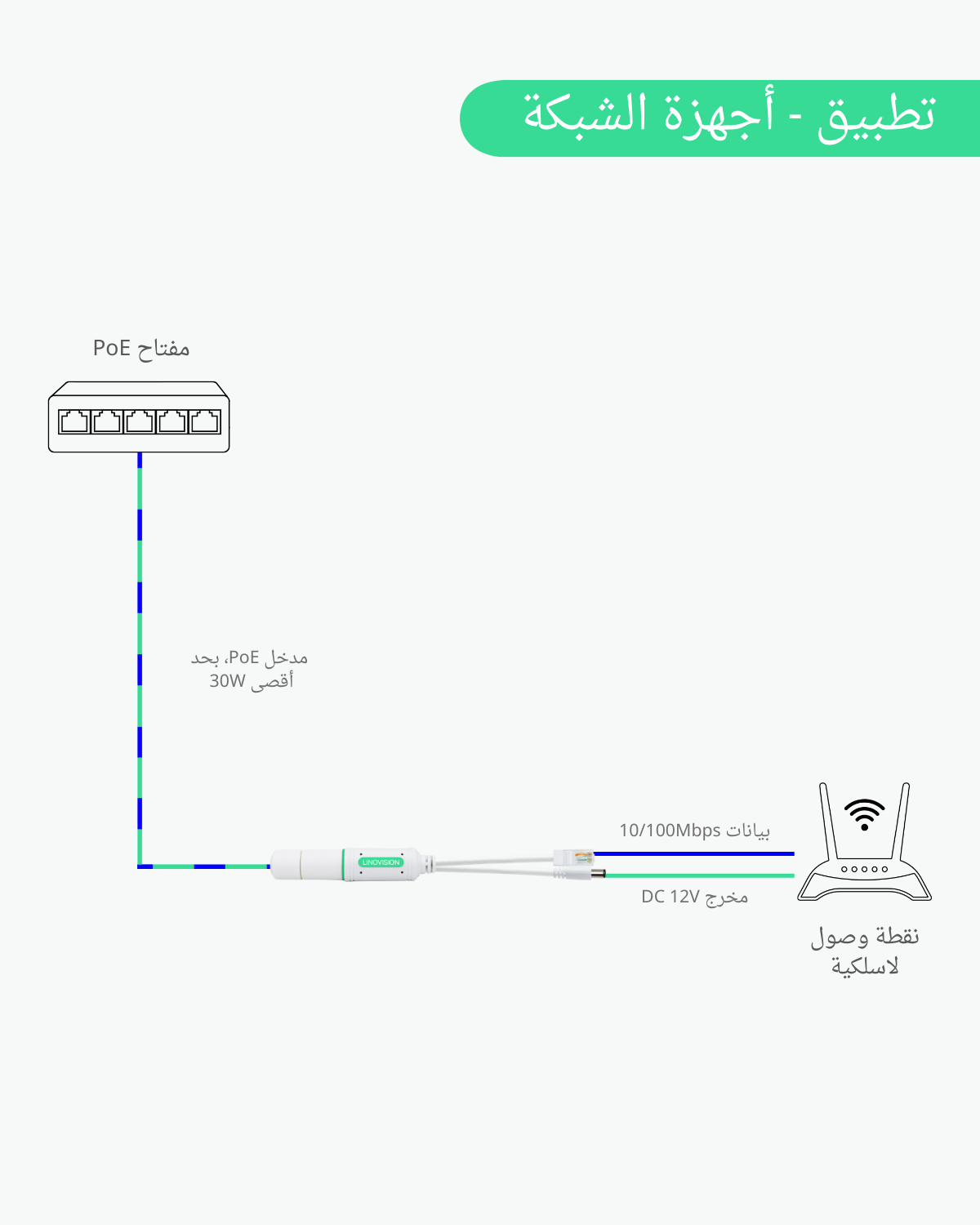 - موزع 12V PoE – يقوم بتقسيم طاقة PoE بمعيار IEEE802.3af/at إلى بيانات بسرعة 10/100Mbps ومخرج طاقة DC12V 1A. يأتي أيضًا مع موصلات DC 12V لتوصيل الأجهزة ذات منافذ DC مختلفة.