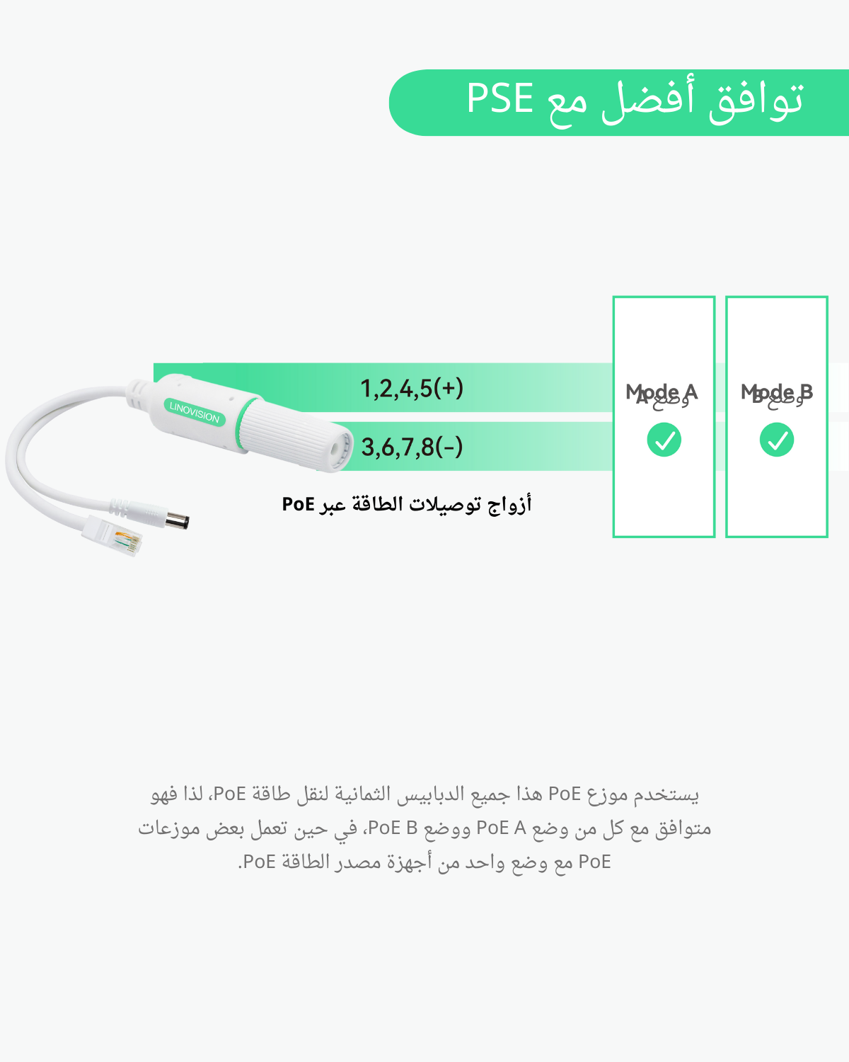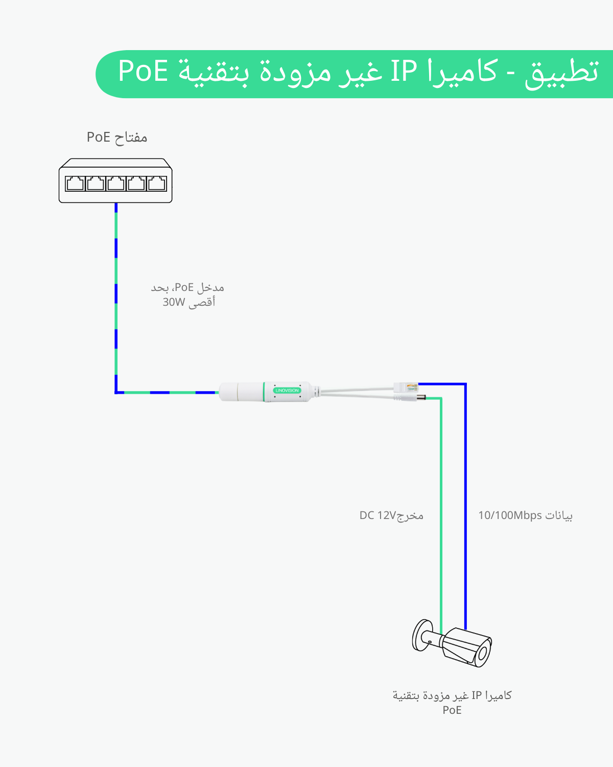مناسب لأنظمة المراقبة CCTV لتغذية كاميرات IP، وكذلك الأجهزة غير الداعمة لـ PoE مثل الميكروفونات، نقاط الوصول اللاسلكية (AP)، هواتف VoIP وغيرها.