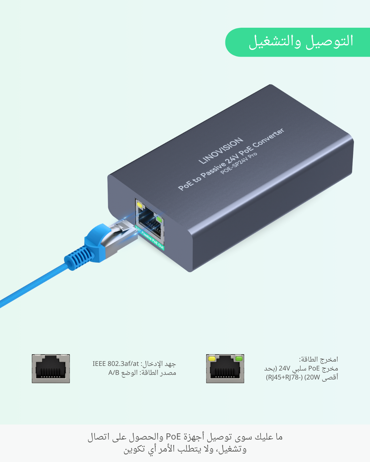 تشغيل الأجهزة التي تعمل بقدرة 24V PoE سلبي باستخدام محول PoE أو محقن يوفّر PoE نشط بقدرة 48V عبر كابلات الشبكة، بدون الحاجة إلى مقابس إضافية أو تمديدات.