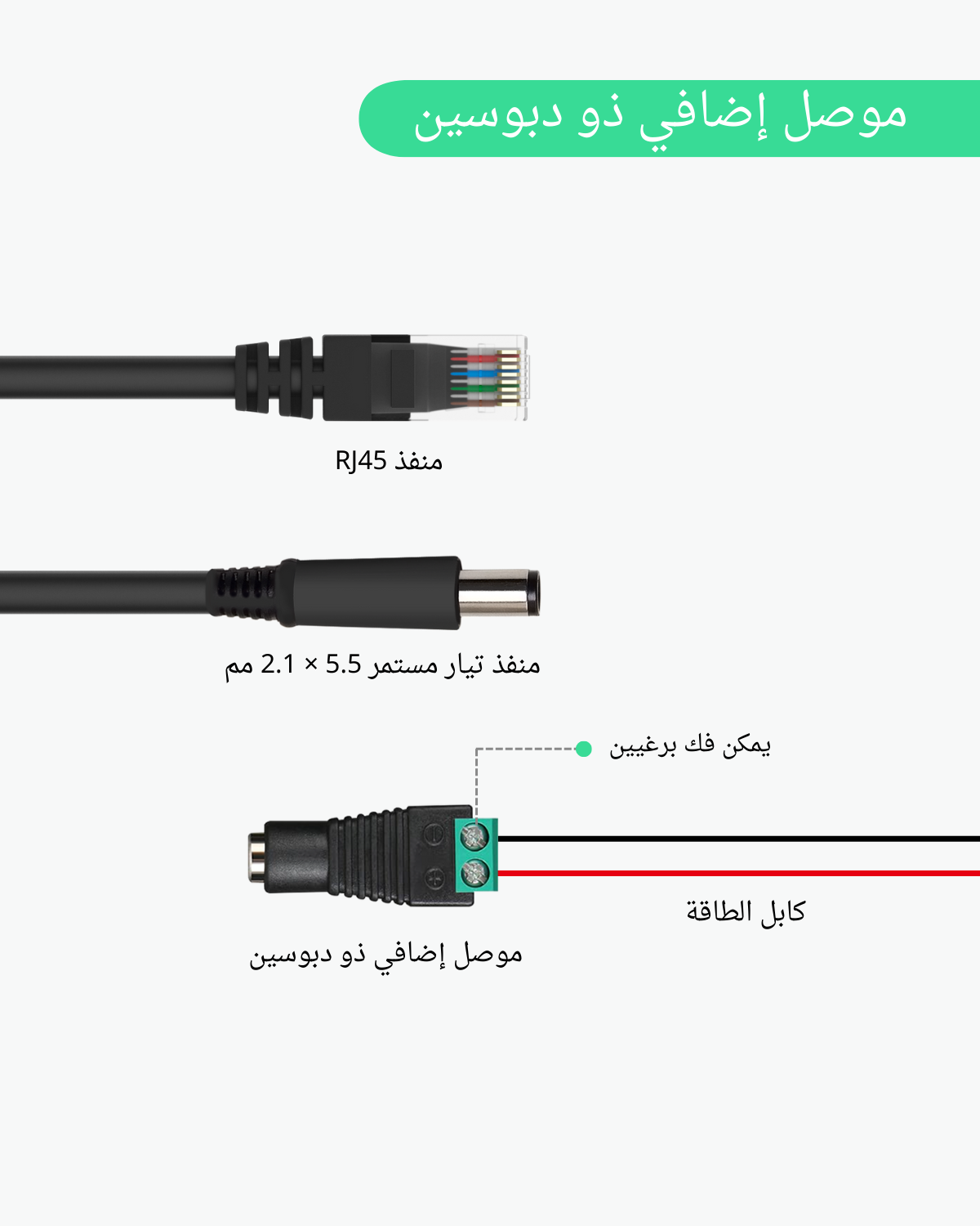 - مخرج DC – يدعم مخرج طاقة DC12V 2A (حجم المقبس: 5.5 × 2.1 مم)، لتغذية الأجهزة غير الداعمة للـ PoE؛ كما يأتي مع موصلات DC 12V لتوصيل الأجهزة ذات منافذ DC مختلفة.