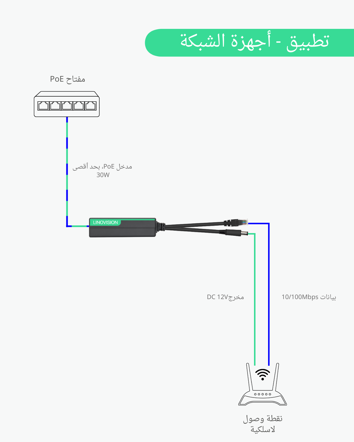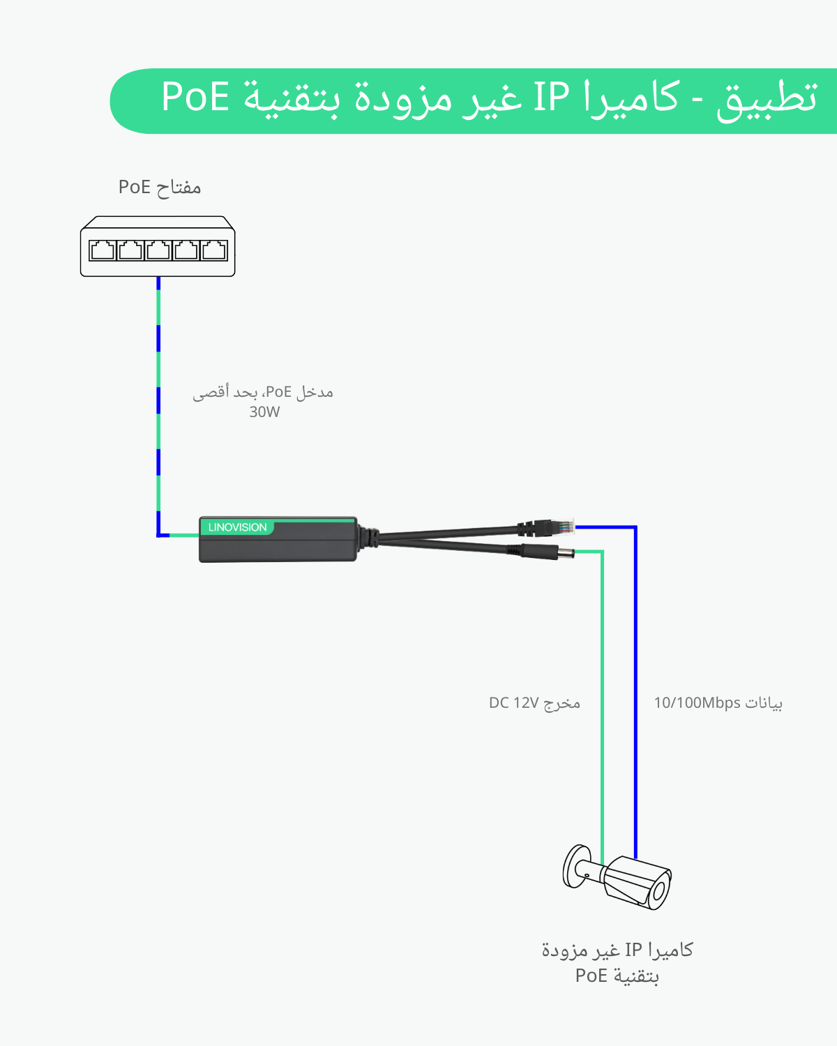 مناسب لأنظمة المراقبة CCTV لتغذية كاميرات IP، وغيرها من الأجهزة غير الداعمة للـ PoE مثل: الميكروفون، نقاط الوصول اللاسلكية (Wireless AP)، هواتف VoIP، إلخ.