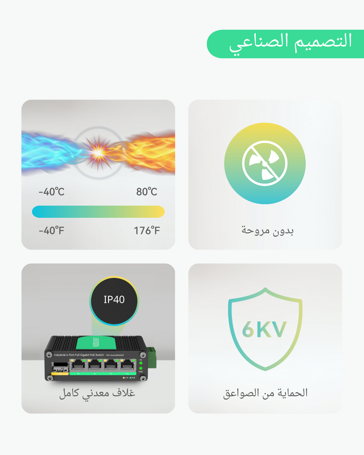 • تصميم صناعي: هيكل معدني متين صغير الحجم IP40؛ درجة حرارة تشغيل واسعة من -40 درجة فهرنهايت إلى 185 درجة فهرنهايت (من -40 درجة مئوية إلى 85 درجة مئوية)؛ يدعم سكة-DIN و يُثبّت على الحائط.