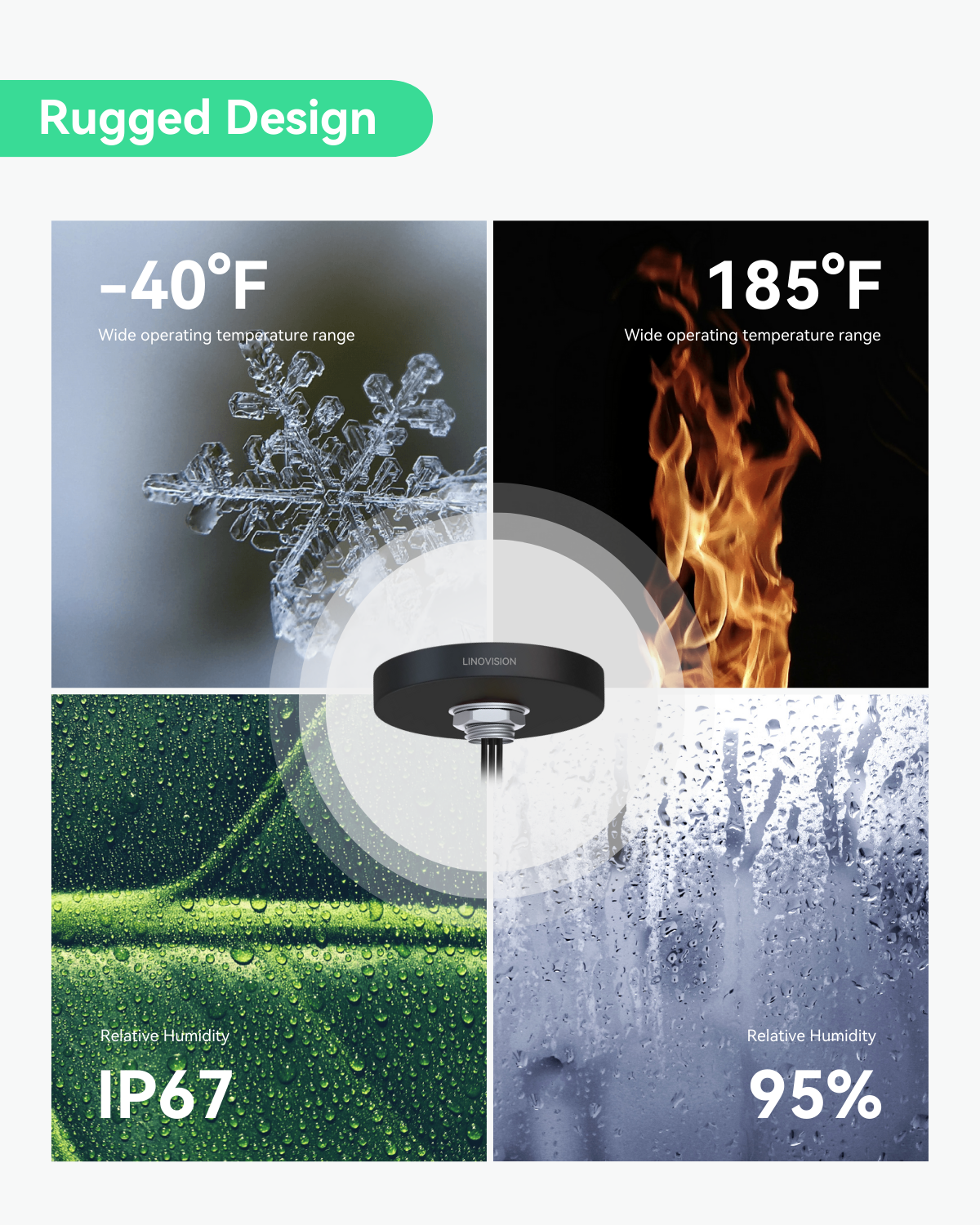 - مقاوم للماء IP67 - مقاوم للماء بتصنيف IP67، ويتراوح نطاق درجة حرارة التشغيل بين -40 و+85 درجة مئوية، مصمم لأداء موثوق في البيئات الخارجية القاسية.