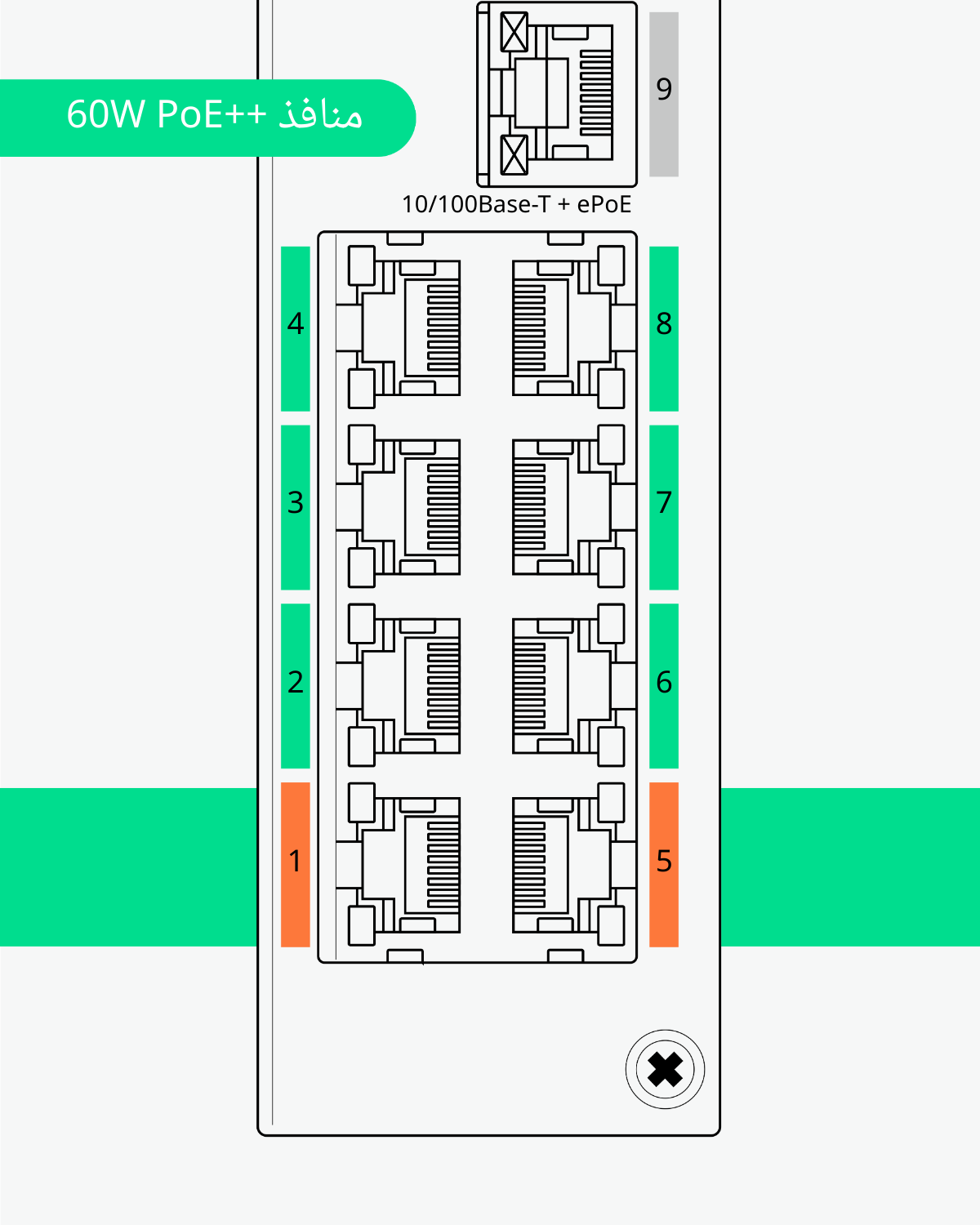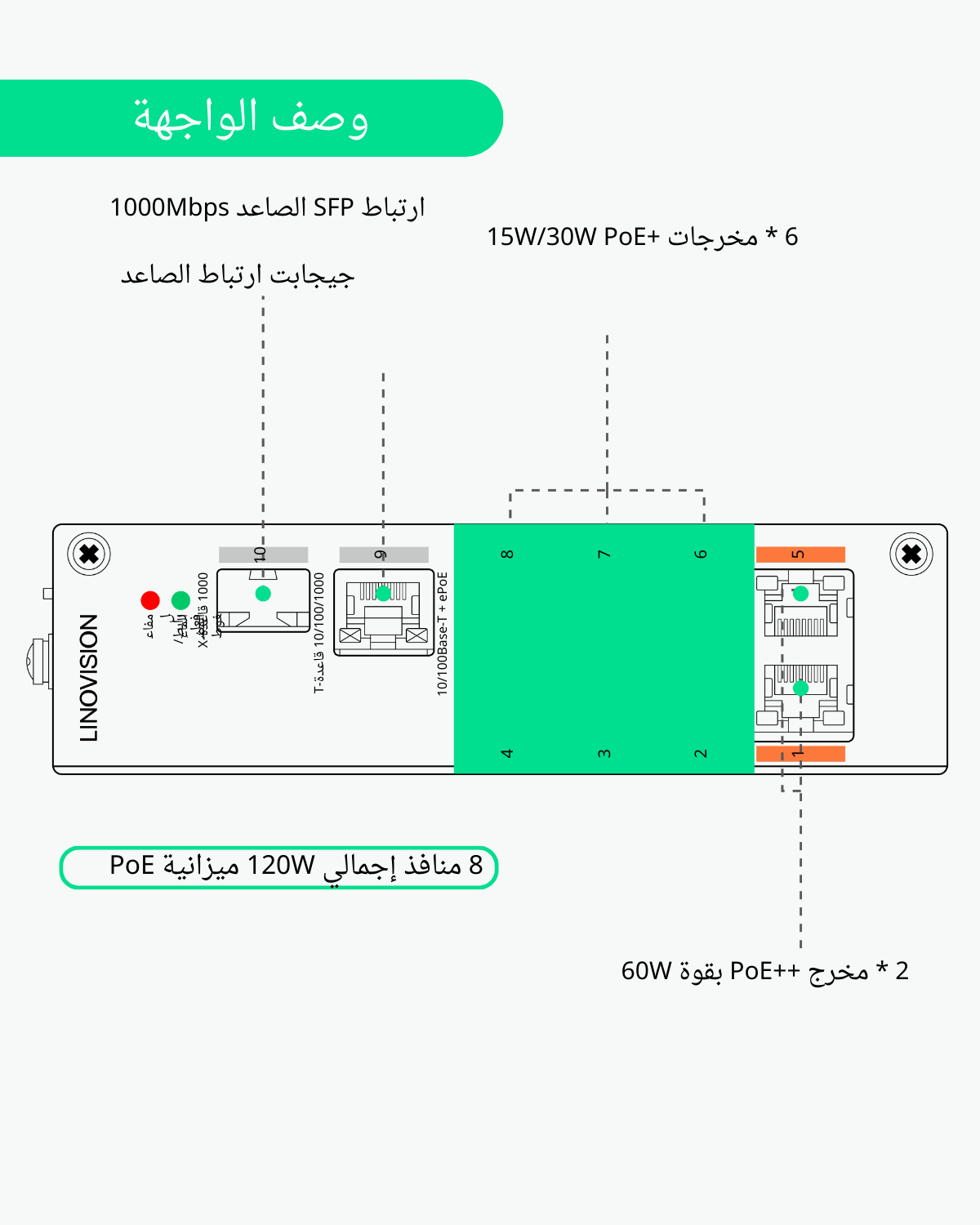 - مخرج Hi-POE 60W - يوفر 8 منافذ مخرج PoE بسرعة 10M/100Mbps. يتوافق المنفذان 1 و5 مع معيار Hi-PoE، وأقصى طاقة مخرج 60W. المنافذ 2، 3، 4، 6، 7، 8 ≤ 30W (IEEE802.3at). إجمالي طاقة PoE هو 120W.