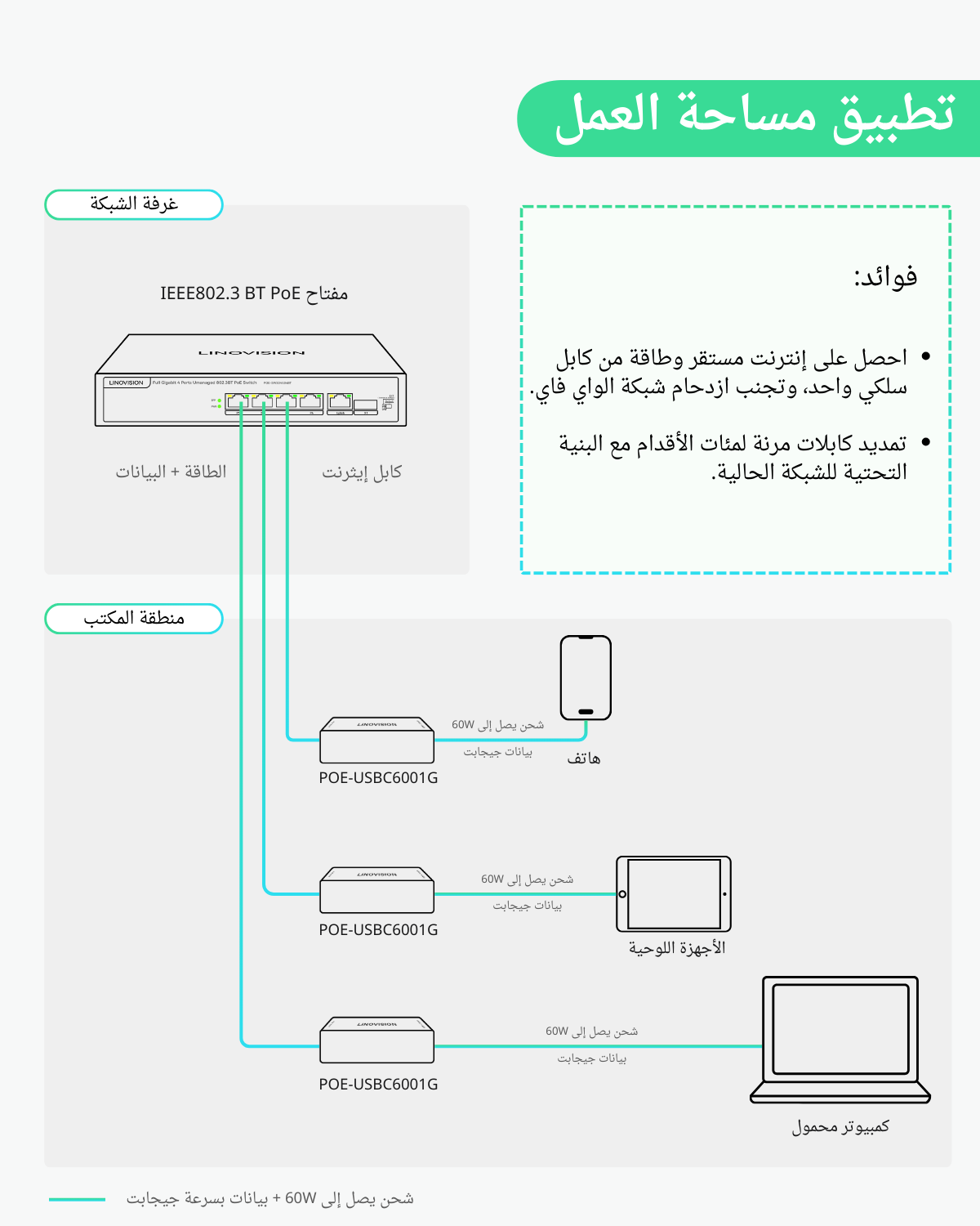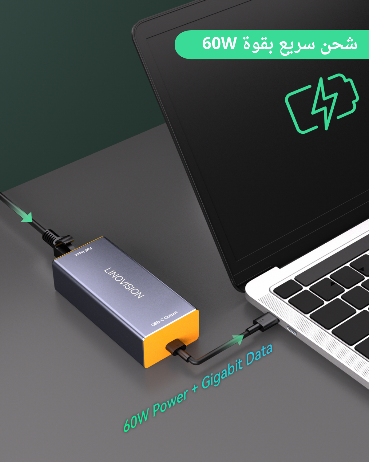 محول جيجابت 60W بتقنية ++PoE إلى USB-C، لنقل البيانات والطاقة عبر كابل واحد