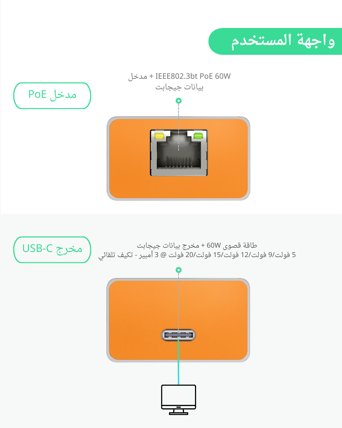 - محول ++PoE إلى USB-C - يحول إشارة ++PoE بقدرة 60W (وفقًا لمعيار IEEE 802.3af/at/bt) إلى USB-C، موفرًا طاقة تصل إلى 60W (5 فولت / 9 فولت / 12 فولت / 15 فولت / 20 فولت، 3 أمبير) وبيانات بسرعة جيجابت لشحن أجهزة Echo Hub والكمبيوتر المحمول والتابلت والهواتف بسرعة عبر كابل إيثرنت واحد.