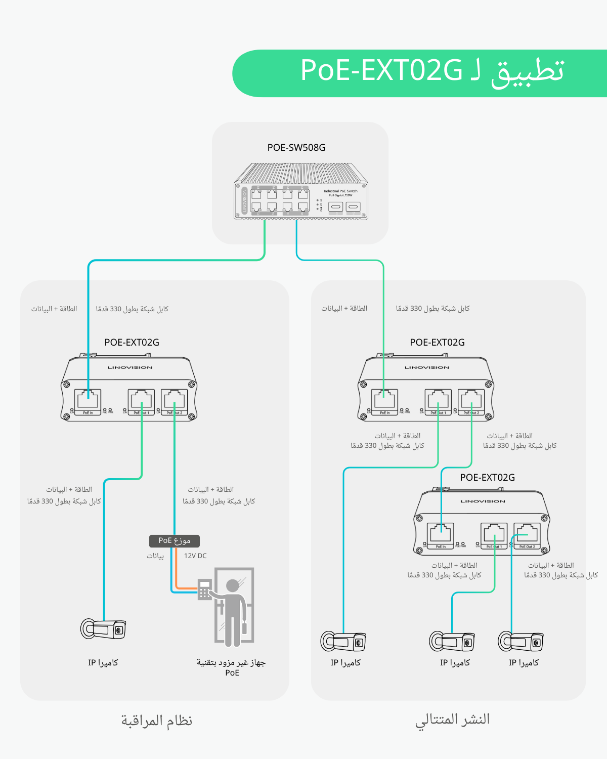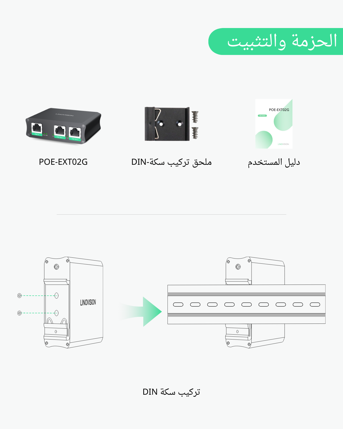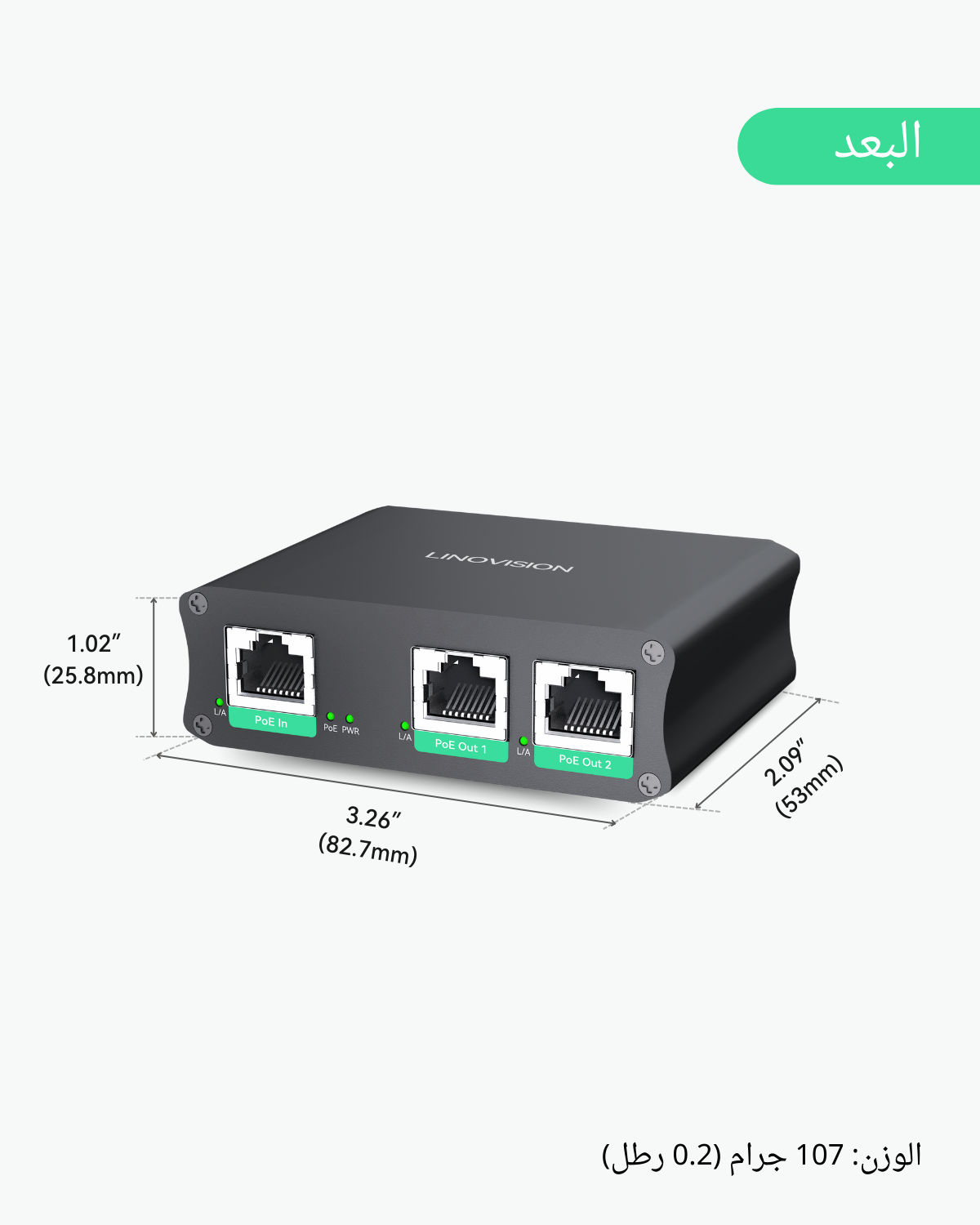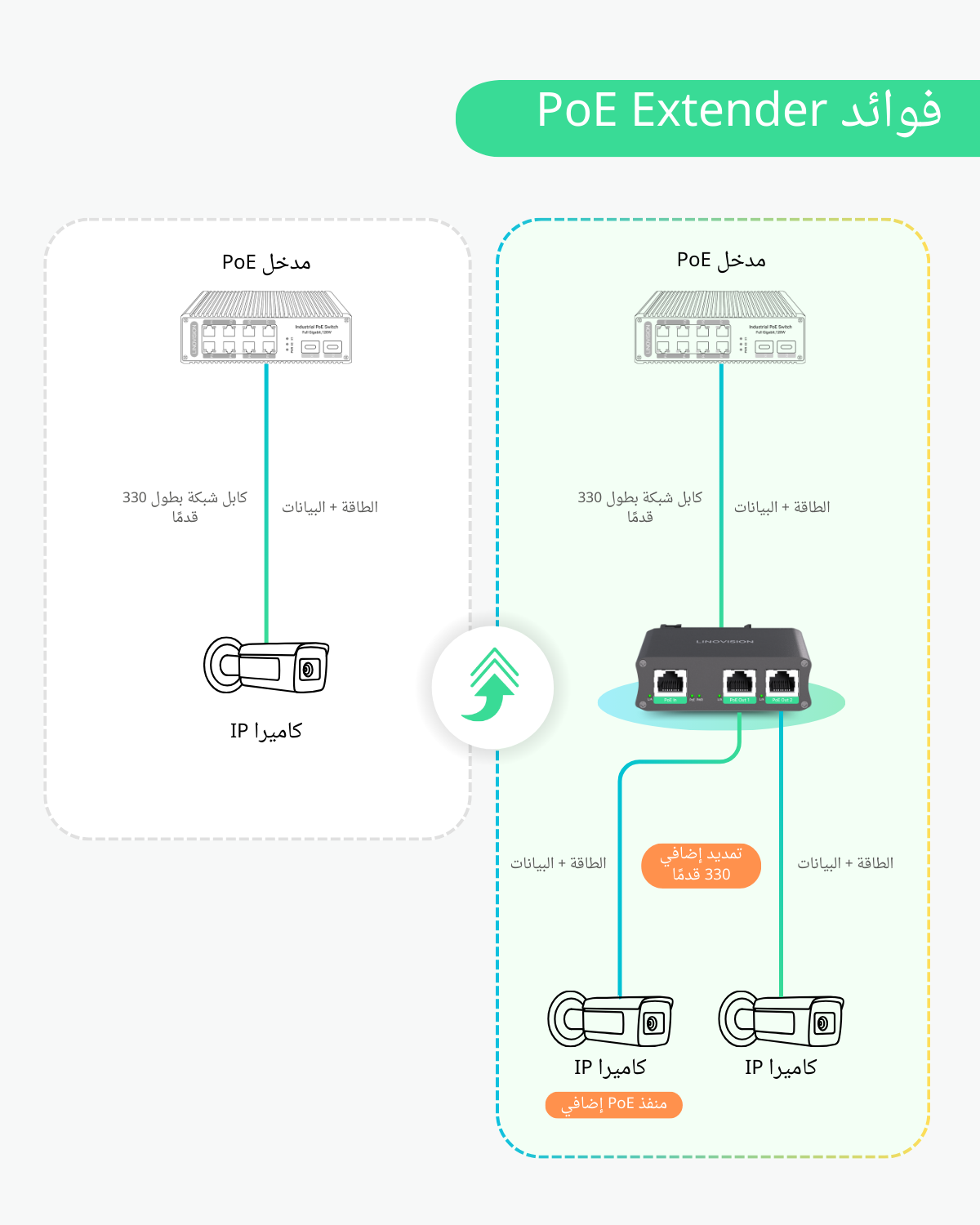 - تمديد POE حتى 330 قدمًا - يُعزز ويوسع إشارة POE + البيانات بمقدار 330 قدمًا إضافية فوق كابل شبكة Cat5E أو Cat6 العادي.