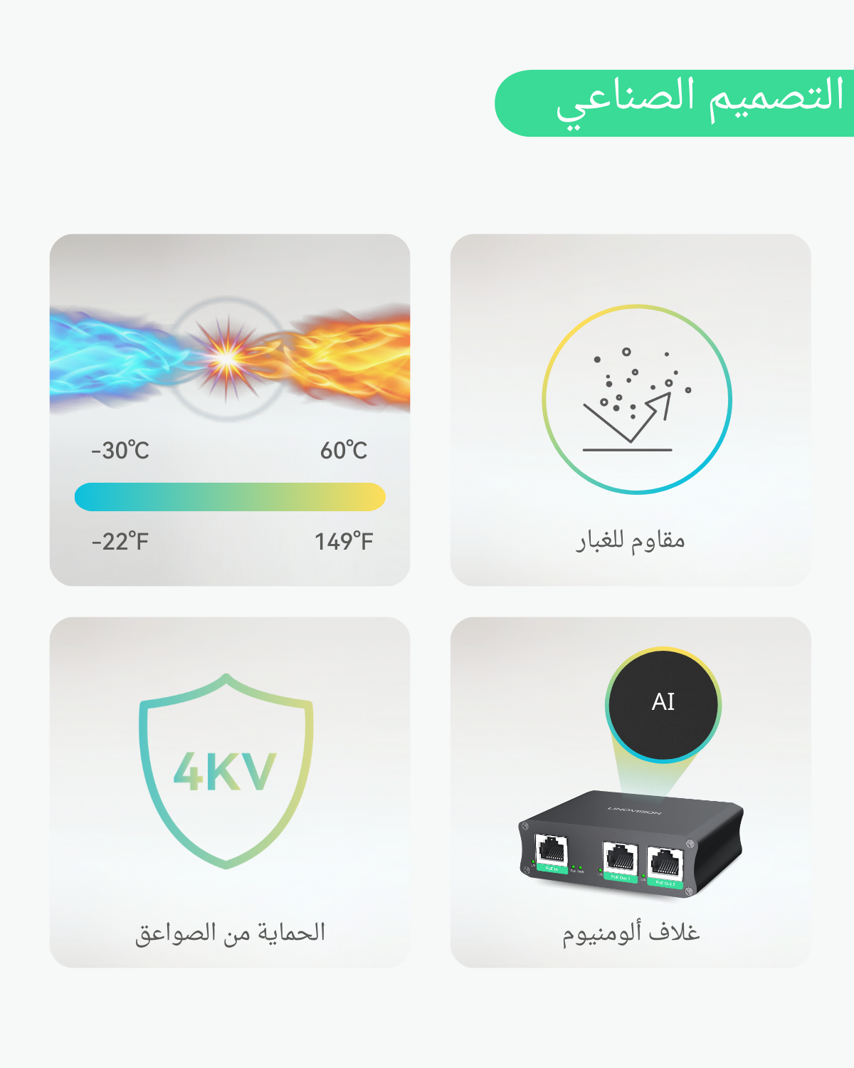 - تصميم صناعي - مناسب للبيئات القاسية، مع علبة معدنية IP53، ودرجات حرارة تشغيل واسعة من -22 درجة فهرنهايت إلى +149 درجة فهرنهايت (من -30 درجة مئوية إلى 65 درجة مئوية)، وتركيب على سكة DIN، وحماية من زيادة التيار الكهربائي 4 كيلو فولت.
