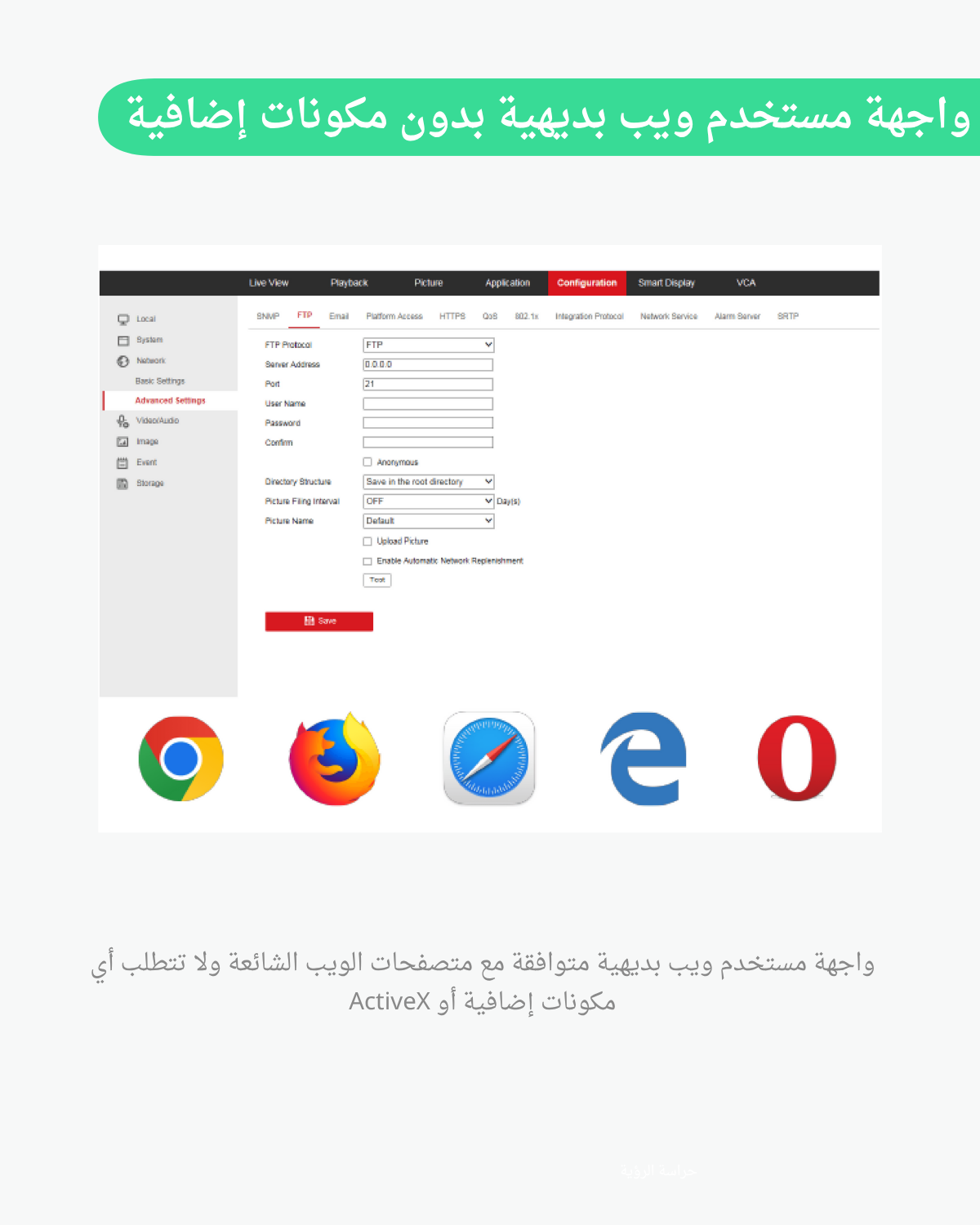 اكتشاف الحركة، إنذار العبث، انقطاع الشبكة، تعارض عنوان IP، تسجيل دخول غير قانوني، امتلاء القرص، خطأ القرص |