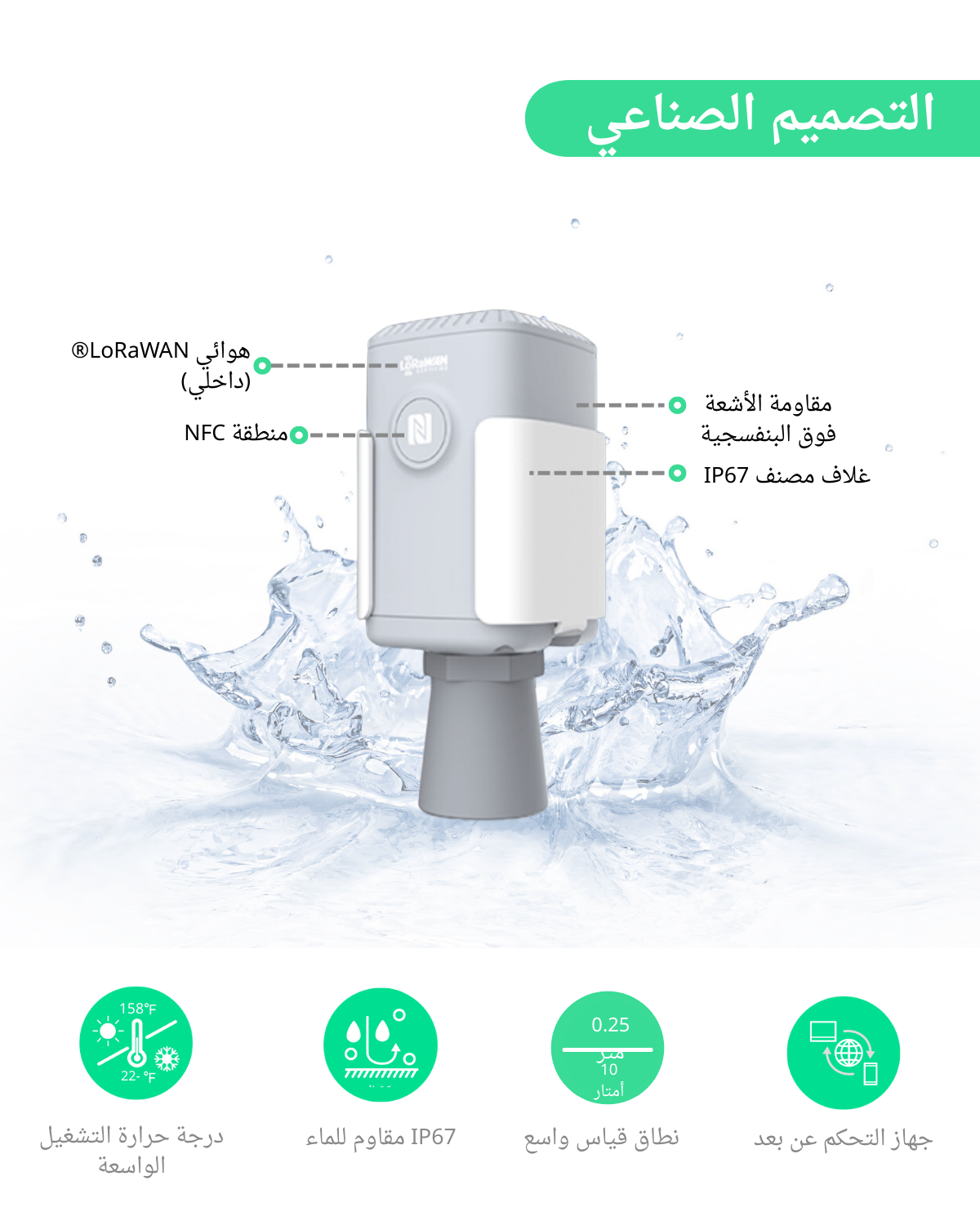 يوفر مستشعر IoT اللاسلكي LoRaWAN قياسًا دقيقًا للمسافة لمجموعة متنوعة من التطبيقات في البيئات القاسية، مثل مراقبة الفيضانات، وإدارة مياه الصرف، ومراقبة مستوى ملء الحبوب أو الأسمدة. يعتمد القياس على الموجات فوق الصوتية المرسلة والمنعكسة من الأجسام القريبة.